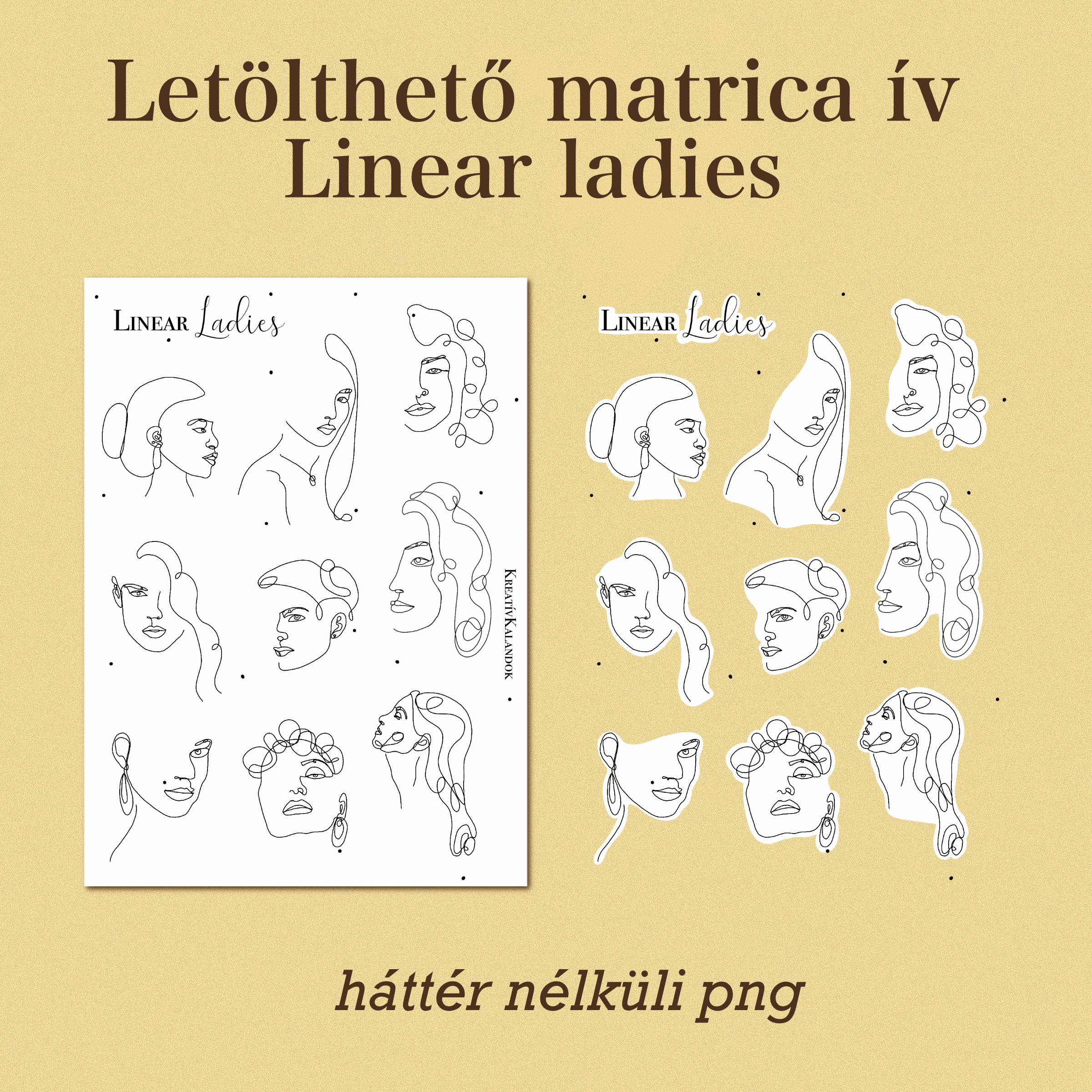 Digitális, letölthető matrica ív (háttérnélküli PNG), amely könnyen nyomtatható, kivágható és digitálisan is használható. A Linear Ladies matrica ív különösen ajánlott line art, minimalista és modern stílust kedvelő alkotóknak.
