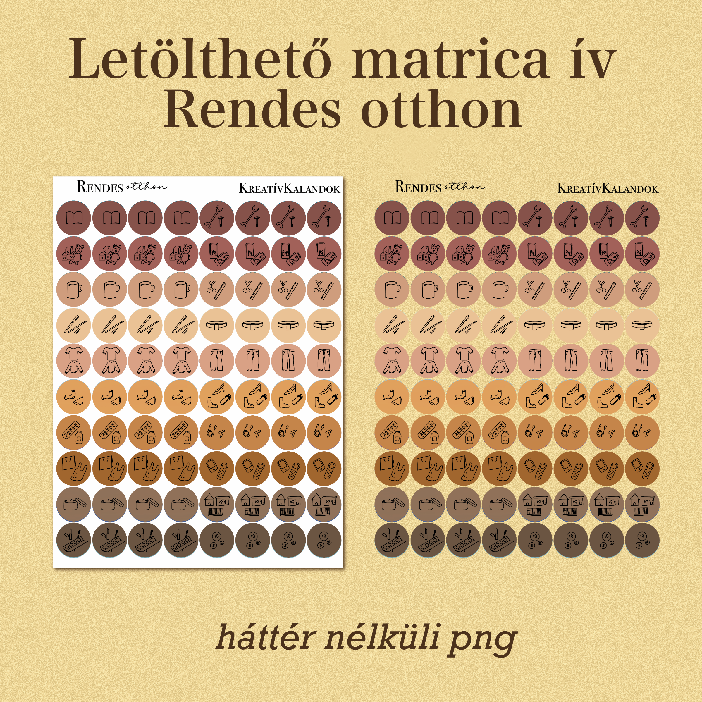A Rendes Otthon matrica ív apró, kör alakú mini ikon matricákat tartalmaz, amelyek a rendszerezés, szelektálás és tudatos otthoni rend kialakításának támogatására készültek. Az íven összesen 10×8 darab, azaz 80 db kis méretű, rendszerezés témájú ikon található letisztult, könnyen értelmezhető stílusban.