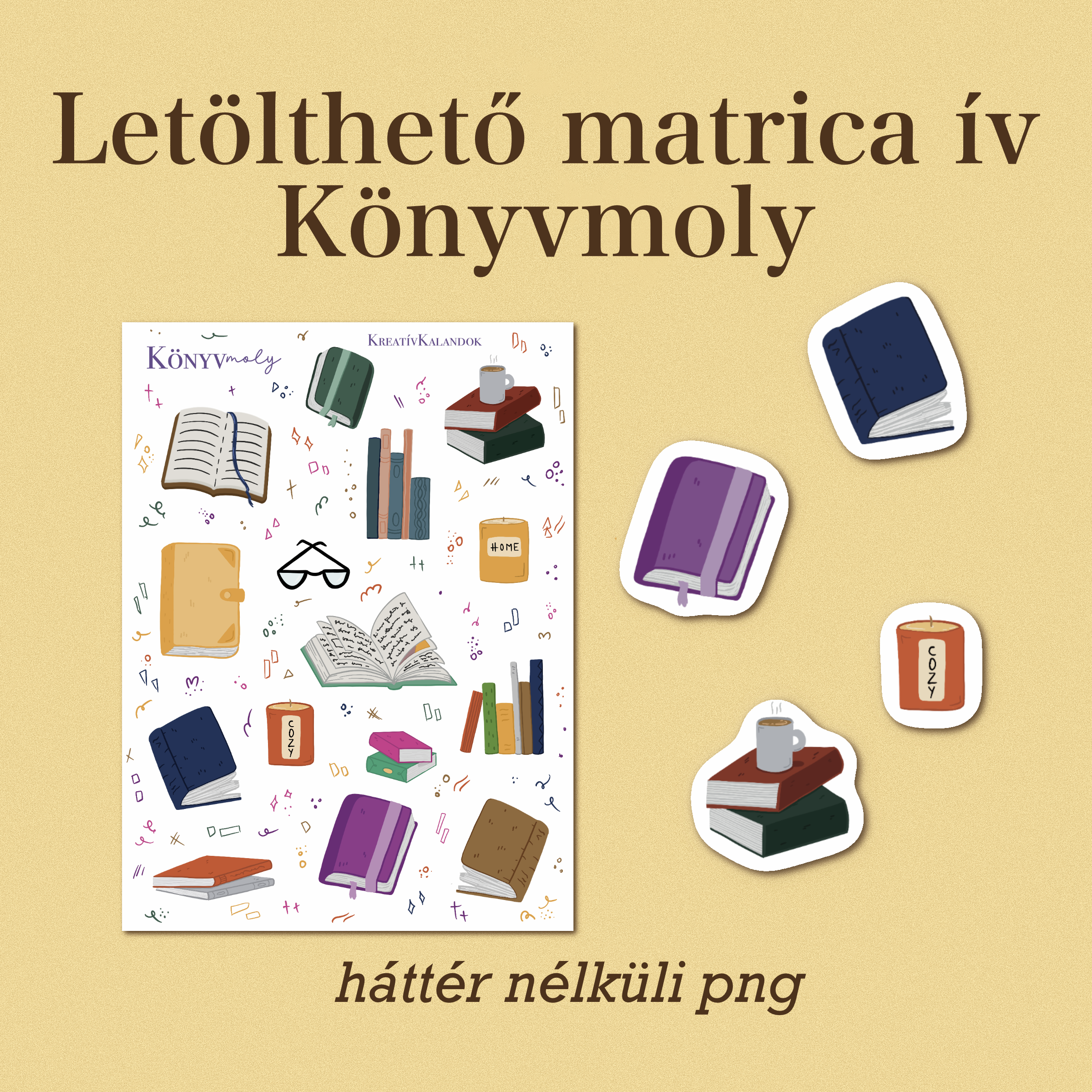 Ez a könyvmoly matricaív egy tematikus sorozat első darabja, amely különböző hangulatú és témájú letölthető sticker sheeteket foglal majd magába, kreatív alkotáshoz, naplózáshoz és dekoráláshoz.
